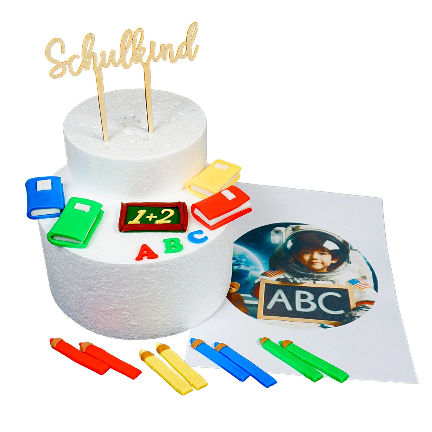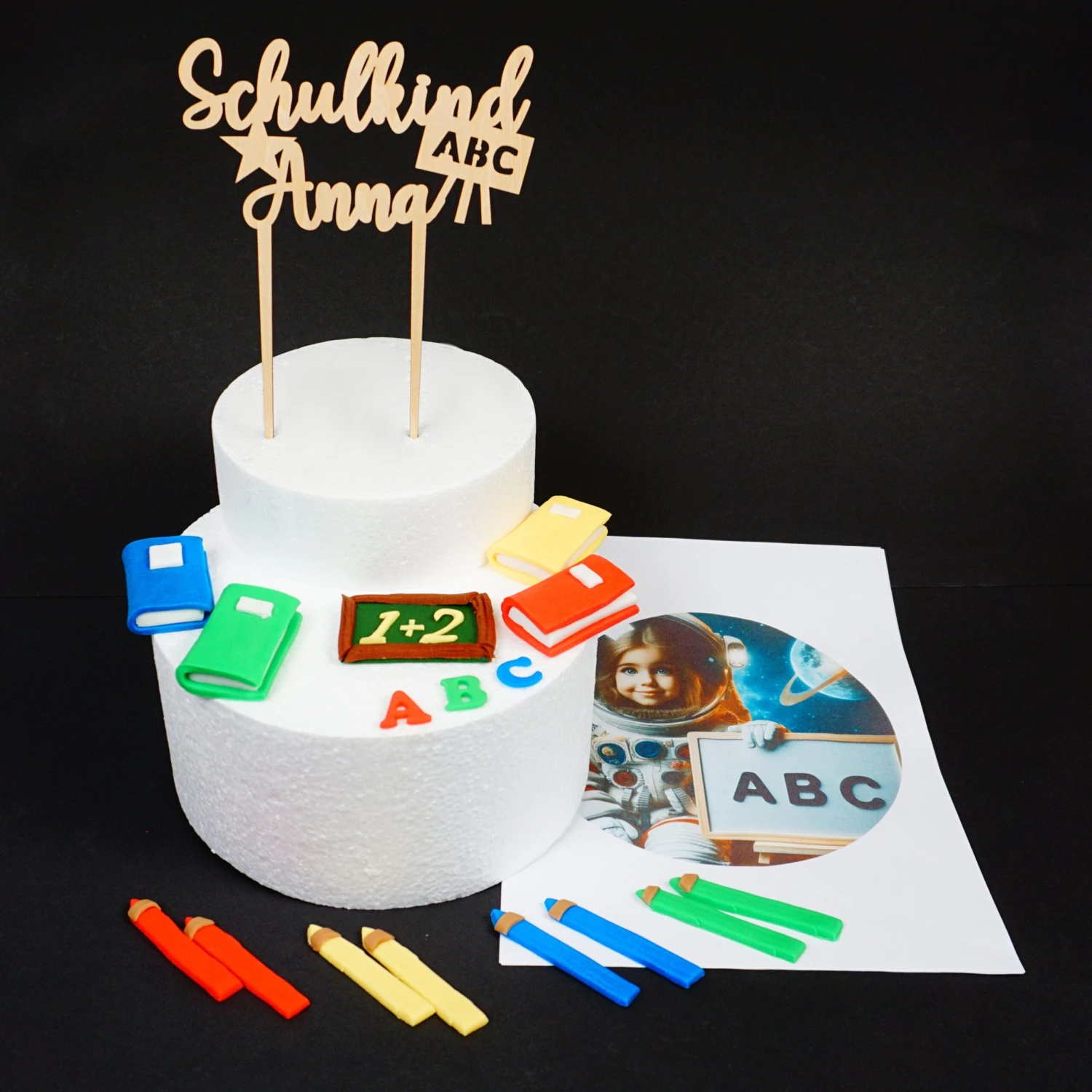 Feiere den Schulstart deines Kindes mit unserem liebevoll gestalteten Einschulungsdeko Set 5 aus Fondant, Aufleger und Namens-Caketopper! Dieses Set enthält alles, was du benötigst, damit deine Torte zu einem echten Highlight wird.