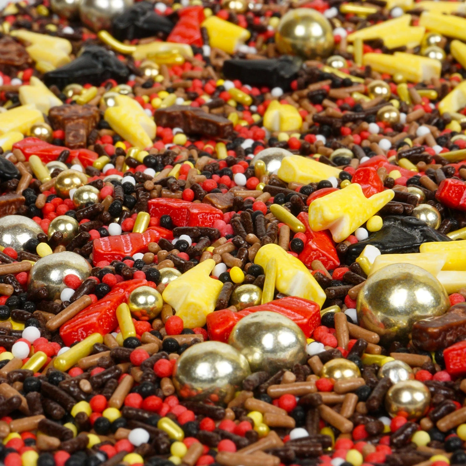 Zucker, Stärke (WEIZEN, Mais, Reis), Mehl (WEIZEN, GANZWEIZEN, gemälzter WEIZEN, Reis), WEIZEN-Kleber, pflanzliche Öle (Raps, Kokosnuss), pflanzliches Fett (Palmöl), Glukosesirup, Vollmilchpulver, Kakao, Kakaobutter, Kakaomasse, Kakaopulver, Farbstoffe (E100, E102*, E120, E129*, E133, E150a, E153, E160a, E172, E174), Lebensmittelfarbe (Johannisbeer-, Karottensaft-, Rettich-, Zitronenkonzentrat), natürliches Vanillearoma, Überzugsmittel (E901, E903, E904), Verdickungsmittel (E406, E414, E460, E464), Emulgator (Lecithin (Sonnenblume, Raps, SOJA), E472a, E473), Gelatine (Rind), Salz. Kann Spuren von NÜSSEN*“E102, E129 enthalten: Kann die Aktivität und Aufmerksamkeit von Kindern beeinträchtigen“.