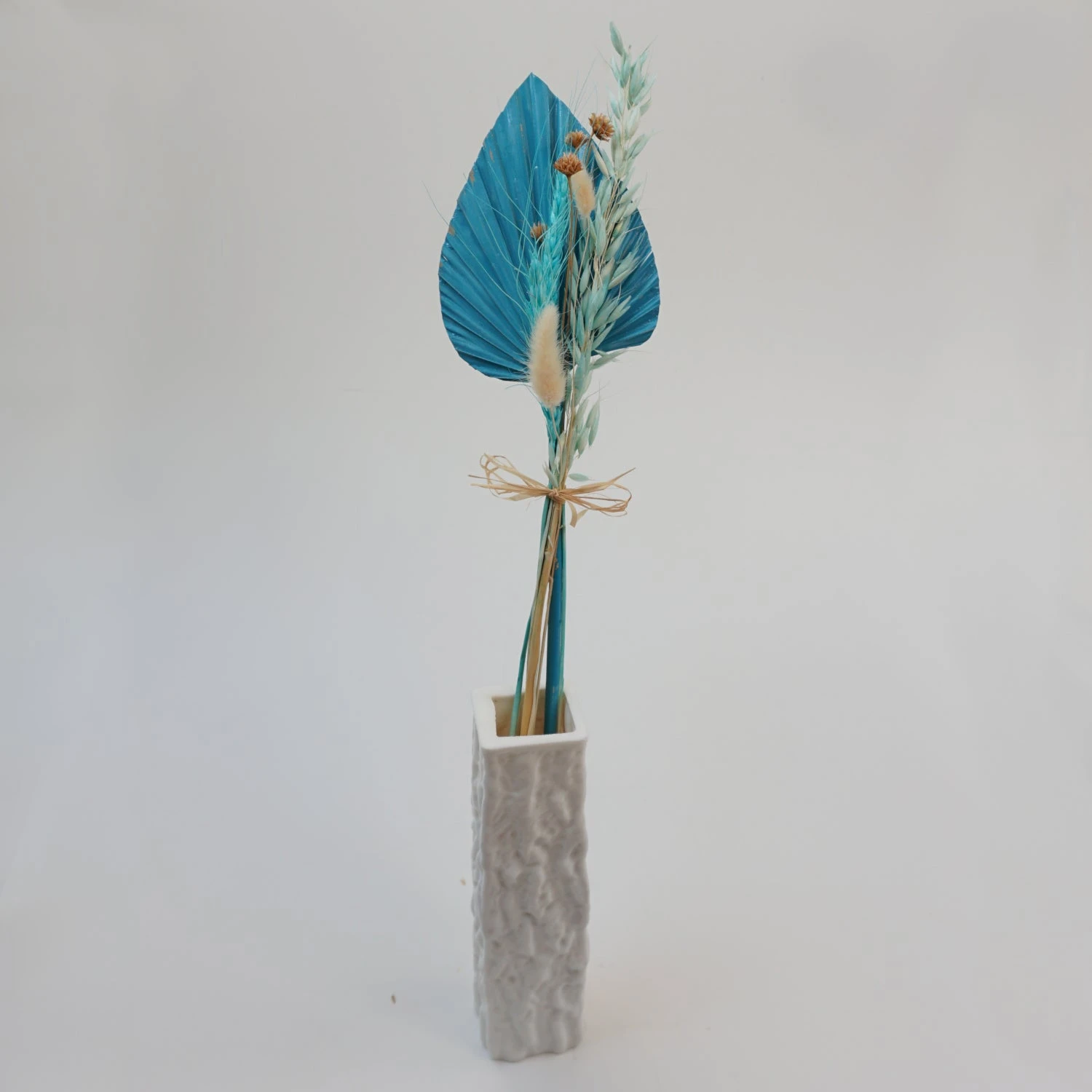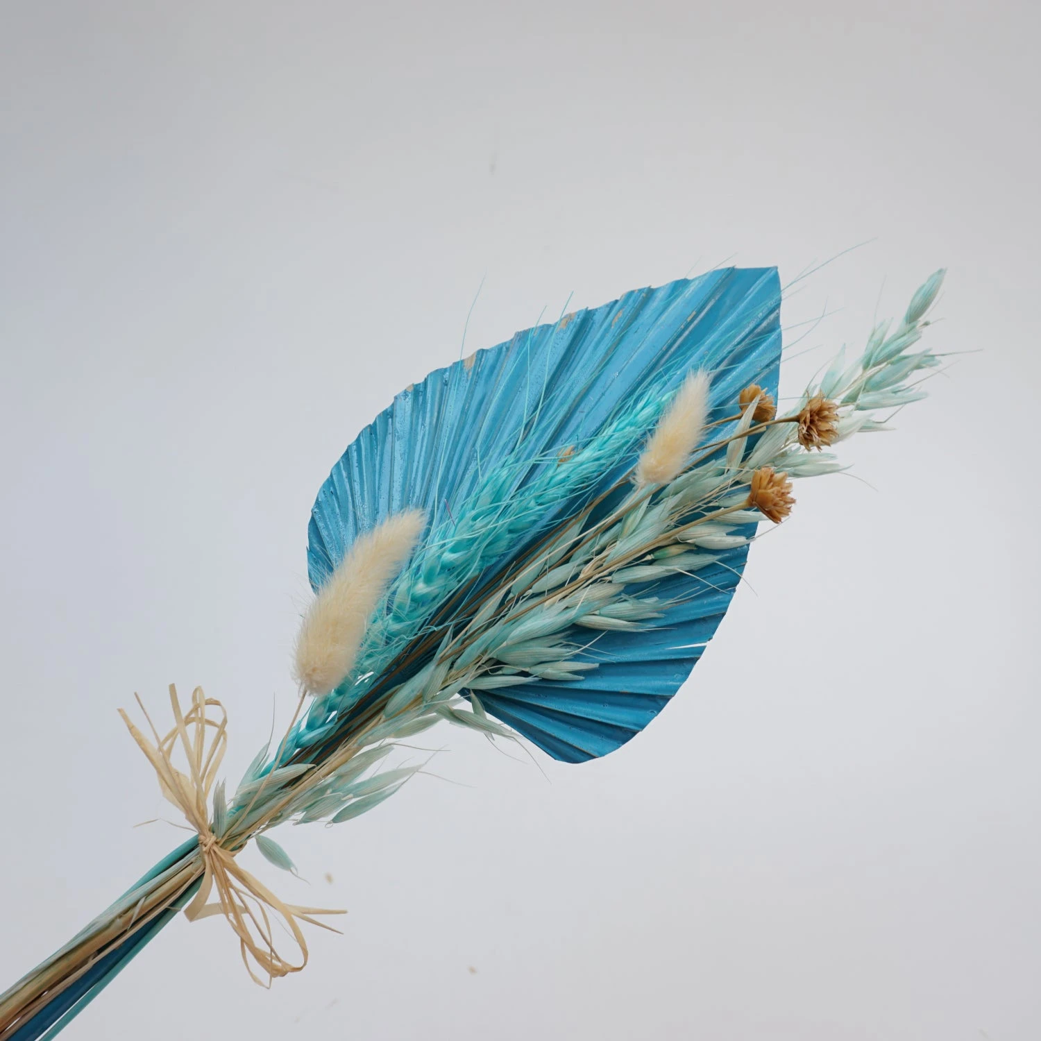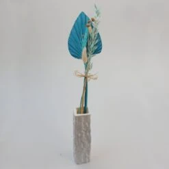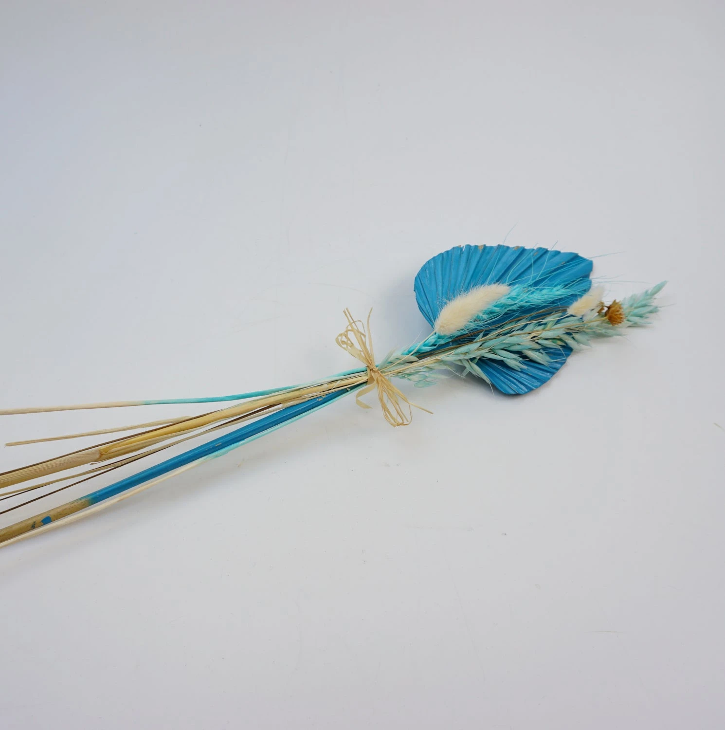 Bouquet aus Trockenblumen, mit Palmblatt in blau, mit ca. 40 cm LĂ€nge.